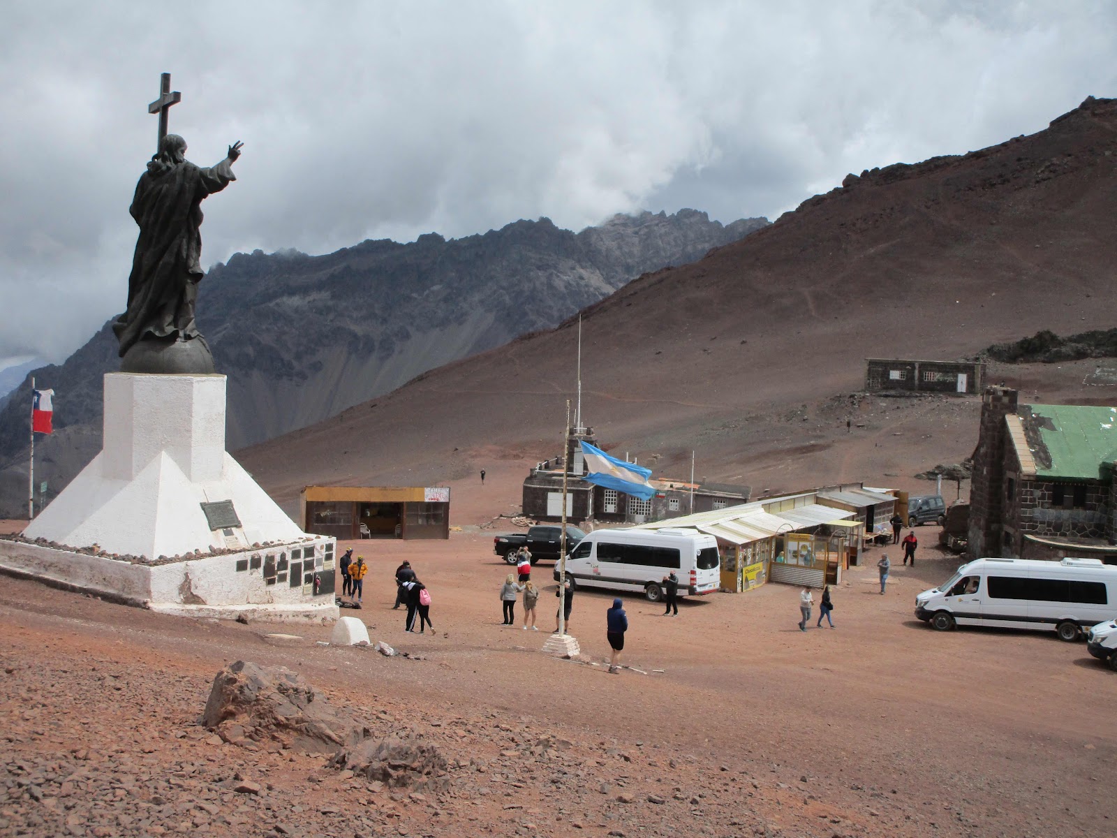 Near the Chilean border, our van made a left turn up a windy, dusty mountain road. We followed it up for several miles, ending up at the statue of Christ de Redeemer. We were at 12,650 feet elevation. It was windy and very chilly. Walking around was effort.
